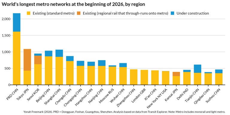 The world keeps building transit: The Transport Politic has charted out all the new public transit lines that opened in 2025, with China managing to cut the ribbon on a whopping 930 kilometers of new metro and light rail service. Meanwhile, we should give some honorable mentions to cities like Tampere, Finland which inaugurated 4.7 km of new light rail, and Ahvaz, Iran which should open 23.3 km of new metro in 2026. In 1990, America boasted four of the world’s top twenty metro systems; in another few years we’ll have zero…