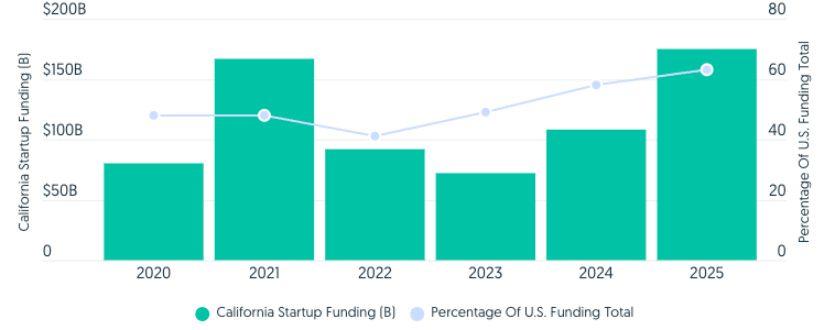 Still golden: Startup seed funding deal sizes have reached record bigness, with over 40% of seed and Series A investment in the year so far going to rounds of $100M+. And despite all the naysayers, California-based companies pulled in 63% of all startup funding last year, a record high.