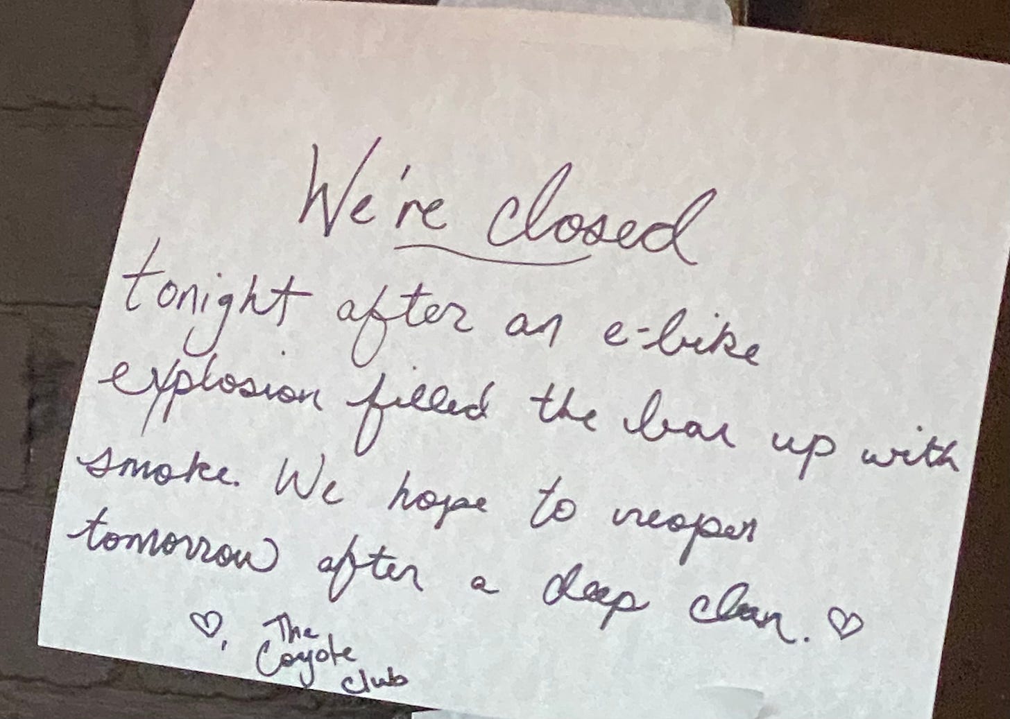 E-bike explosion, but not the good kind. You’ve heard all about those battery fires on cheap Chinese scooters and bikes (usually when they’re improperly charged.) Even when the damage is non-catastrophic, it can still impact local businesses, per this sign I peeped.