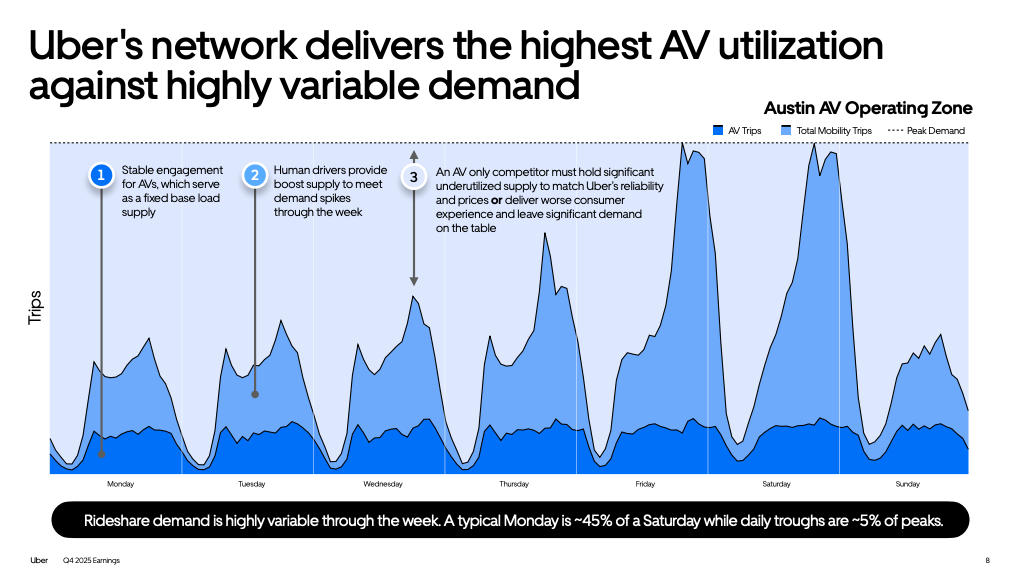 Uber makes its case for AV dominance: Uber released a supplement to its Q4 earnings, laying out its case for why the company thinks it’s well positioned to win the robotaxi race. The whole doc is worth a gander, but some interesting stats: new riders grow by 9 percentage points when Uber launches AVs in a metro; Uber claims it gets better vehicle utilization and lower ETAs than first-party AV platforms; and by mixing both human machine drivers it can better serve both peak and trough demand periods. (I will take issue with a bit of the data cherry picking: for example they call out the density of certain cities by their municipal boundaries, as opposed to the actual sub-regions served by AV providers.)