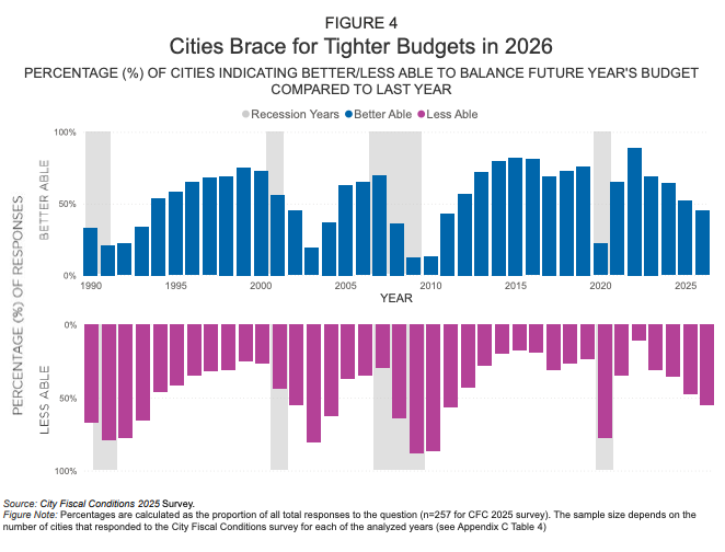 Sorry, cities: Municipalities across the country are facing financial headwinds, with average spending levels only up 0.7% in Fiscal Year 2025, basically falling behind inflation; the forecast for 2026 is even bleaker. California governments have the added headache of the total self-own from AB 218 (Lorena Gonzalez Fletcher.) Instead of resolving the issues with a grand jury or special commission, we’ll just spend all our tax dollars on pay days for big law firms and subsequent fraud…