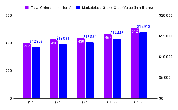 If you’ve noticed a lot more delivery workers on the streets lately, your eyes aren’t deceiving you: they’re probably moving meals for DoorDash, which saw total orders rise 27% YoY to 512 million. Marketplace gross order value hit a cool $15.9 billion, growing 29% YoY; compare that to Uber Eats’ corresponding growth of 8% (or 12% in a constant currency basis) to $15 billion.