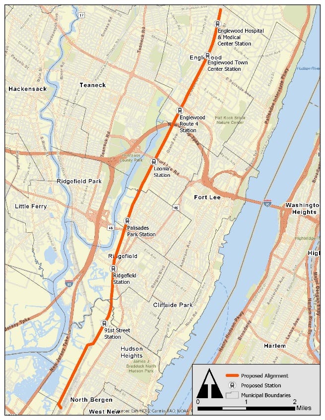 Zooming over to the Bergen County that sits across the Hudson from Manhattan, things are less rosy. Despite being home to some of the densest municipalities in the country, the county currently has no LRT or subway service. And plans to rectify that just got curtailed, as the FTA ordered NJ Transit to redo an environmental impact report, finding that some of the data in it was too old. Gee, I sure hope the new report finds that trains are greener than cars! In 2020 the ~9 mile project — which would largely reuse an existing freight corridor — was budgeted at about $133M per mile.