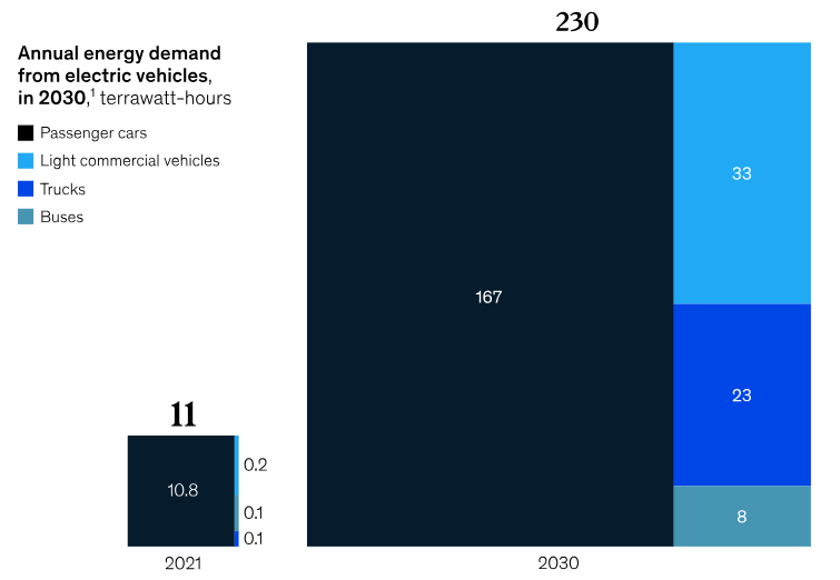 To make sure we don’t end up with the third scenario we need to consider the switch from refilling gas tanks to recharging batteries. There is plenty of skepticism about whether we’d be able to meet this demand due to a variety of factors, some of which we’ll go over. For this, the first question to address is, “How much charging capacity will we need?”. Thankfully, the folks over at McKinsey have taken a pass at figuring this out to estimate that by 2030, there will be a demand for 230 terawatt-hours of energy by EVs, compared to just 11 TWh in 2021.