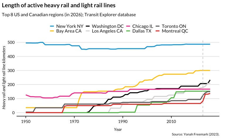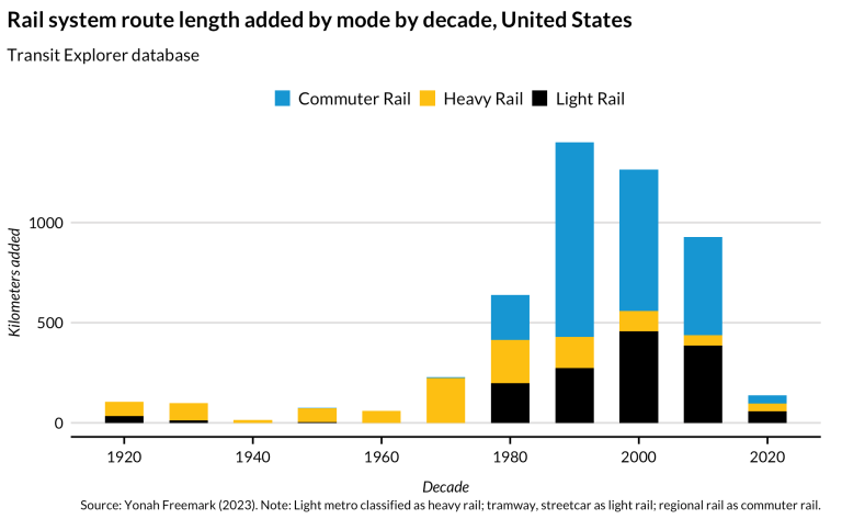American transit decline is nothing new… While we may bemoan America’s transit struggles, the sad truth is that this peculiar case of American exceptionalism is nothing new. Fresh data from The Transport Politic bears that out, showing how for decades American cities have built far less transit than those in other regions of the world. One particularly stark example is that New York City is the only global city with fewer miles of heavy and light rail today than in 1950. Also of note is how little of America’s housing (both long extant and newly built) is actually near functional transit. We won’t fully realize the potential of the curb until we can use it for more than just storing our overly plentiful nationwide car collection.