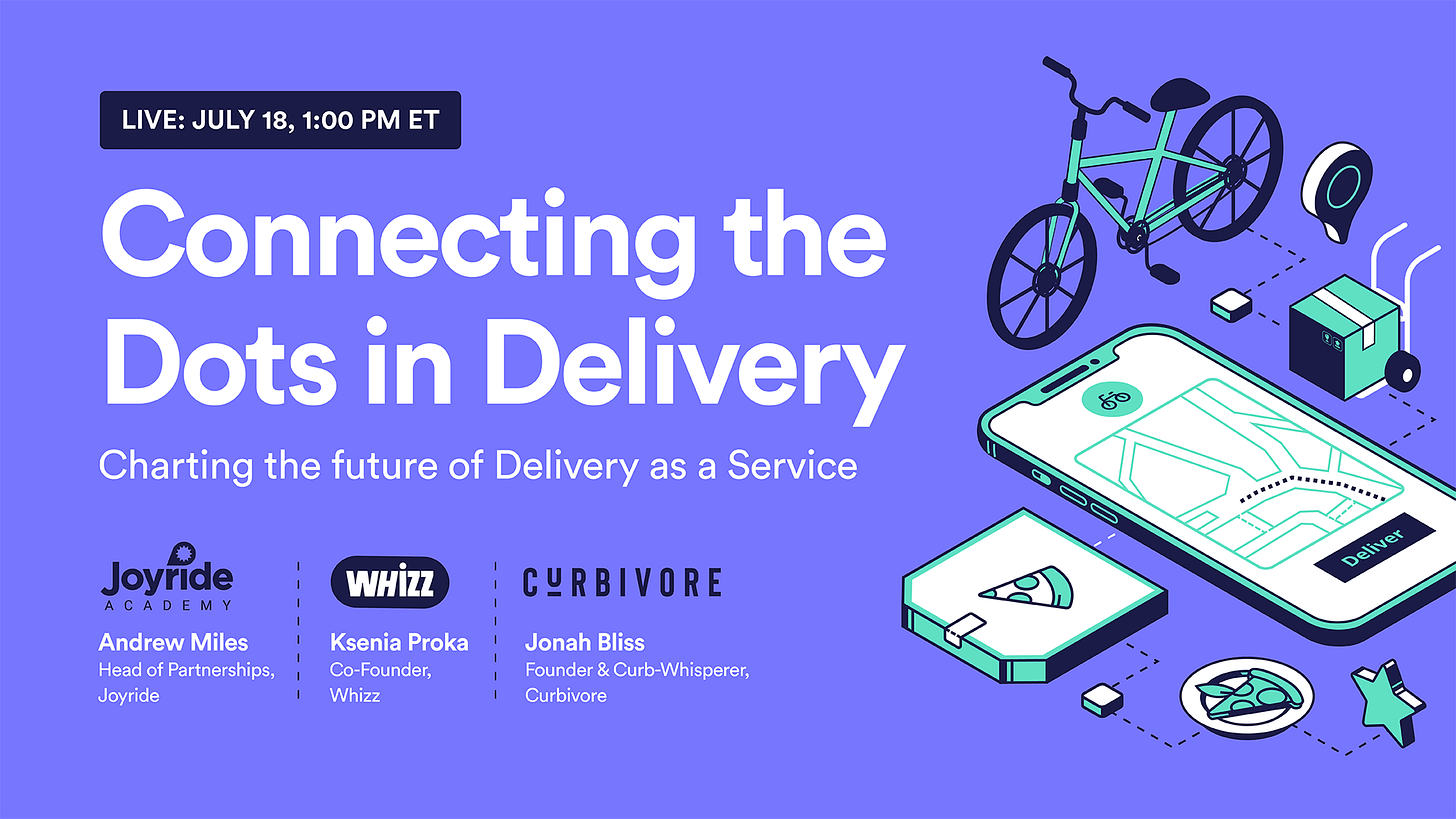Connecting the Dots in Delivery: Not in NYC? Instead tune in to “Connecting the Dots in Delivery - Charting the future of Delivery as a Service" featuring yours truly, Joyride’s Andrew Miles and Whizz’s Ksenia Proka. Airs 10 AM PT on 7/18, register now.