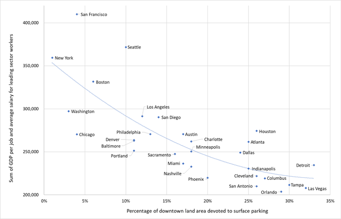 Parking poor, money rich: A new report on “America's Urban Future, Post-Pandemic” is full of useful data on the diverging prospects of various American metro areas both pre and post pandemic. One chart that caught our eye: more economically productive cities don’t festoon their downtowns with asphalt parking lots.