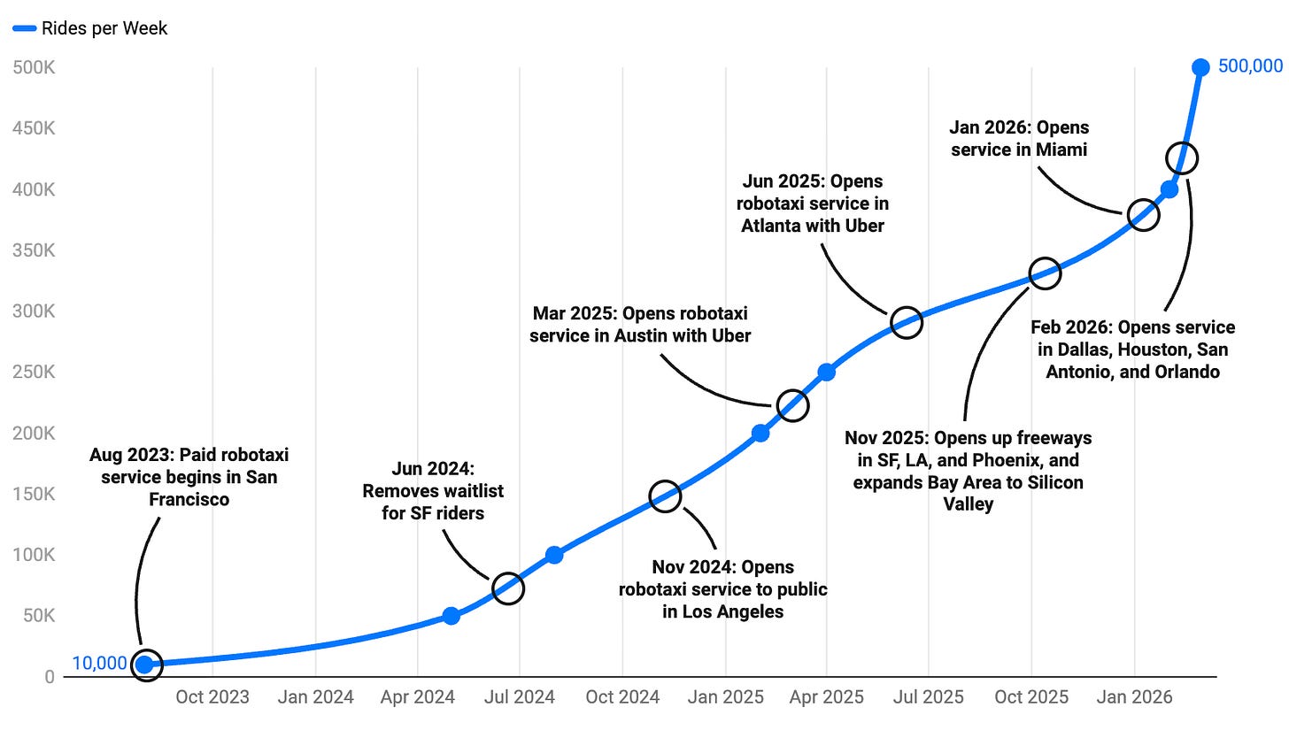 Waymo takes off: Waymo’s AV services continues to grow in leaps and bounds, with the service now providing 500,000 paid rides per week, across 10 markets. Per TechCrunch’s crunching the data, it looks like growth has hit the “hockey stick” phase.