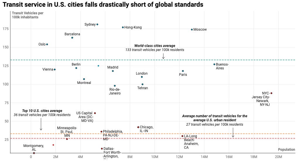 What would it take to make American transit great? About $229 billion annually, according to Transportation for America, representing a 2.5X increase from current spending. The group finds that the average U.S. city has only 27 transit vehicles per 100k residents, as compared to 133 for world-class cities.
